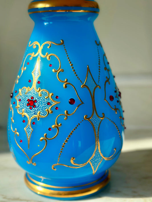 Sold outBejeweled blue art glass vase