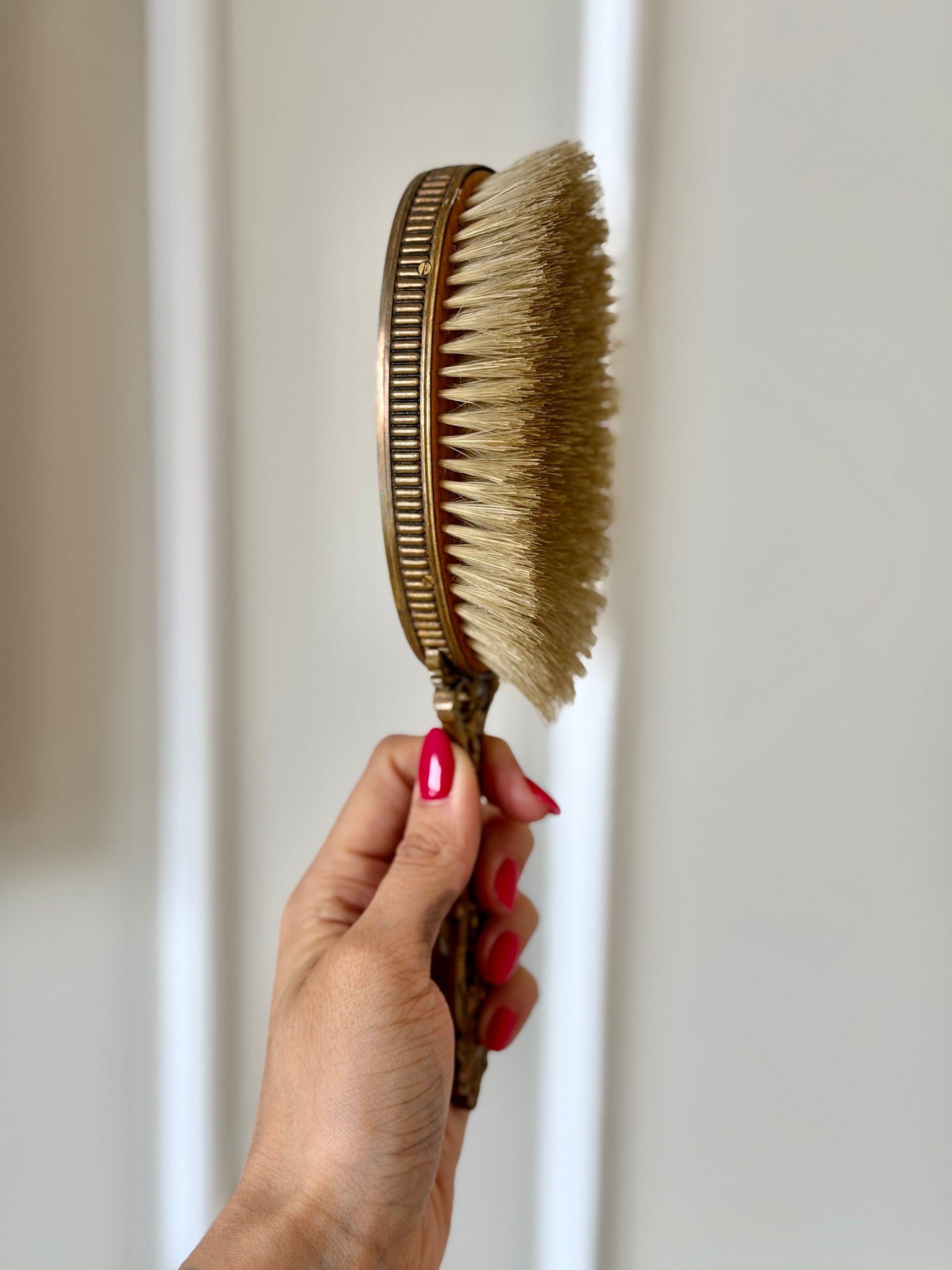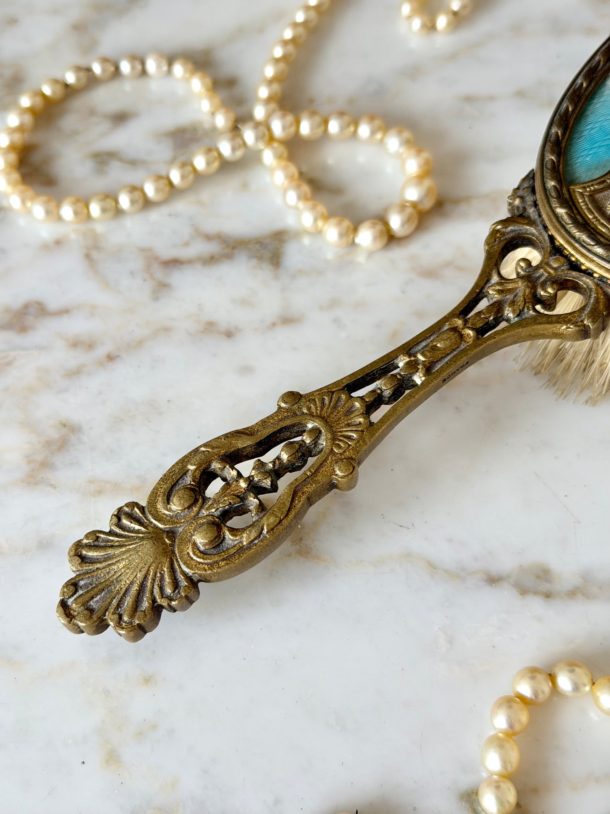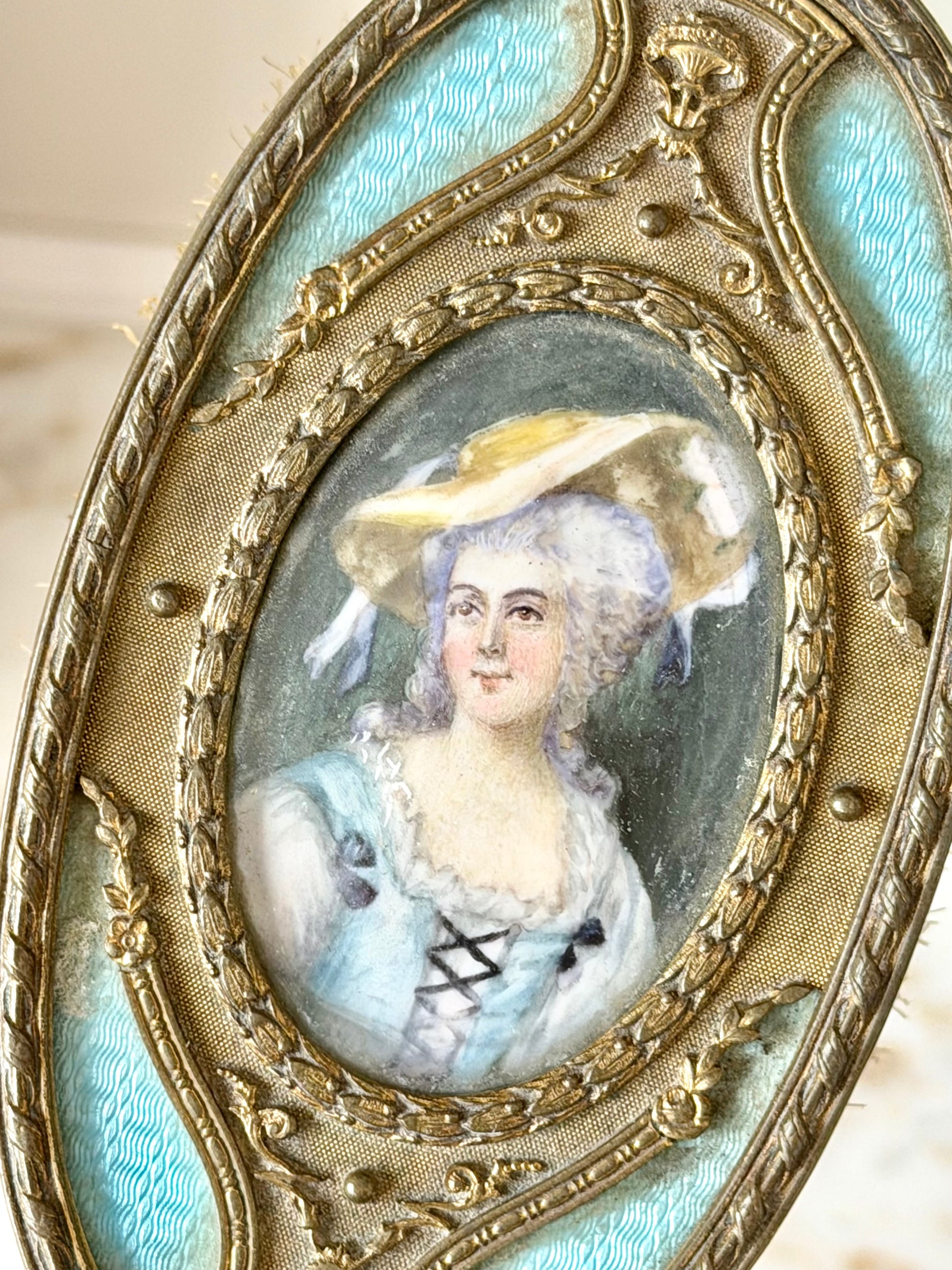 A luxurious vanity brush featuring guilloché enamel and a portrait medallion, blending personal grooming with decorative art. It evokes refined dressing table rituals of the past. Displayed alongside perfume bottles or trays, it creates a beautifully layered vanity scene. Features removable boar bristles.
